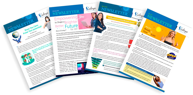 To showcase our vision and mission, Kaloya Dermatech has developed an interactive marketing, sales and planning newsletter. It is a platform where we share all the current trends, challenges, case studies, tips, concerns, connectivity secrets with practical means. This enhanced communication tool is a smart way to interact and build trust with your clients as they will be seeing a side of yours that many companies don't show.